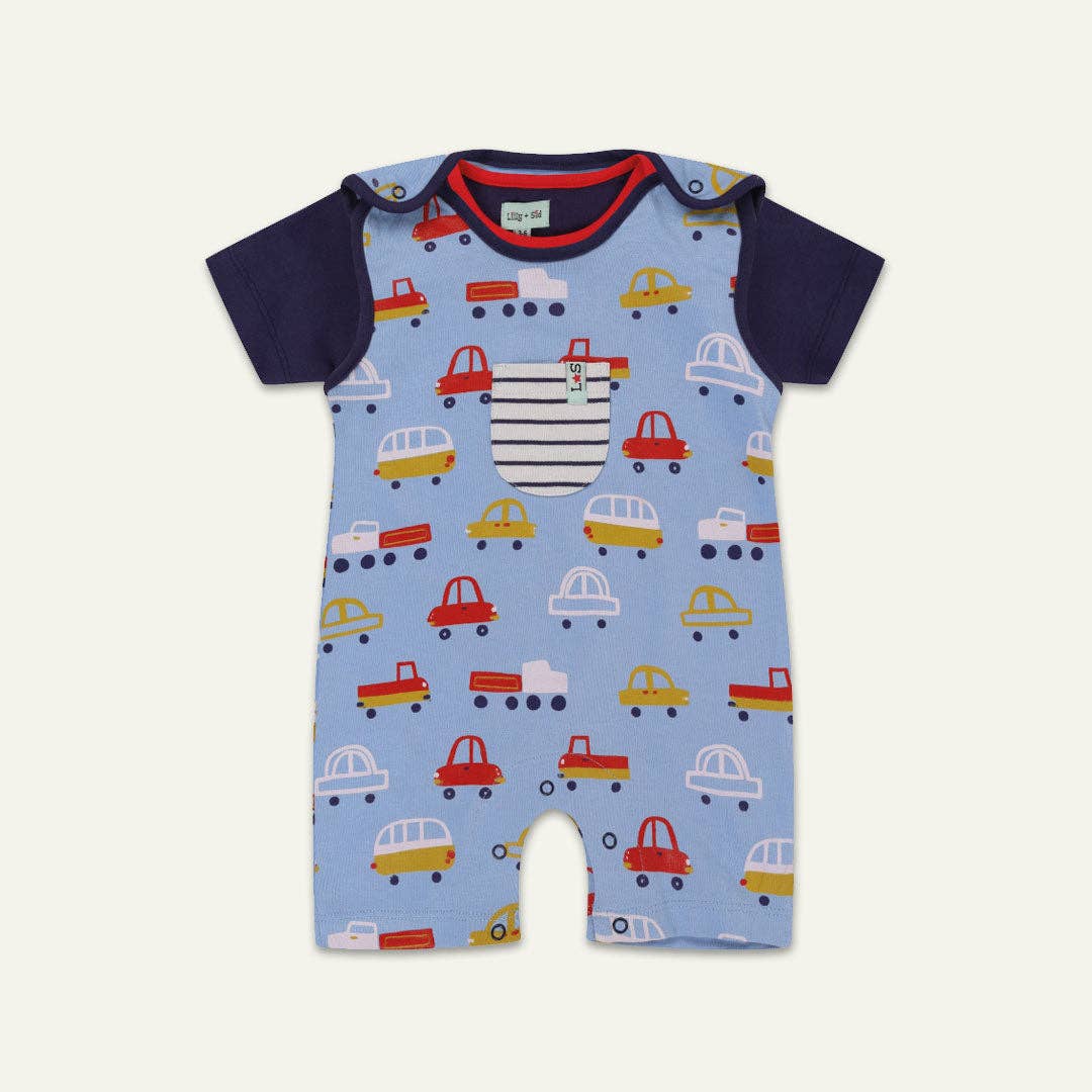Our jersey dungarees set is a stress-free style solution for little ones! With a contrast stripe pocket and a navy stripe top to complete the look, these are a fab style option for everyday play and comfort. This car print will delight your mini drivers this season.