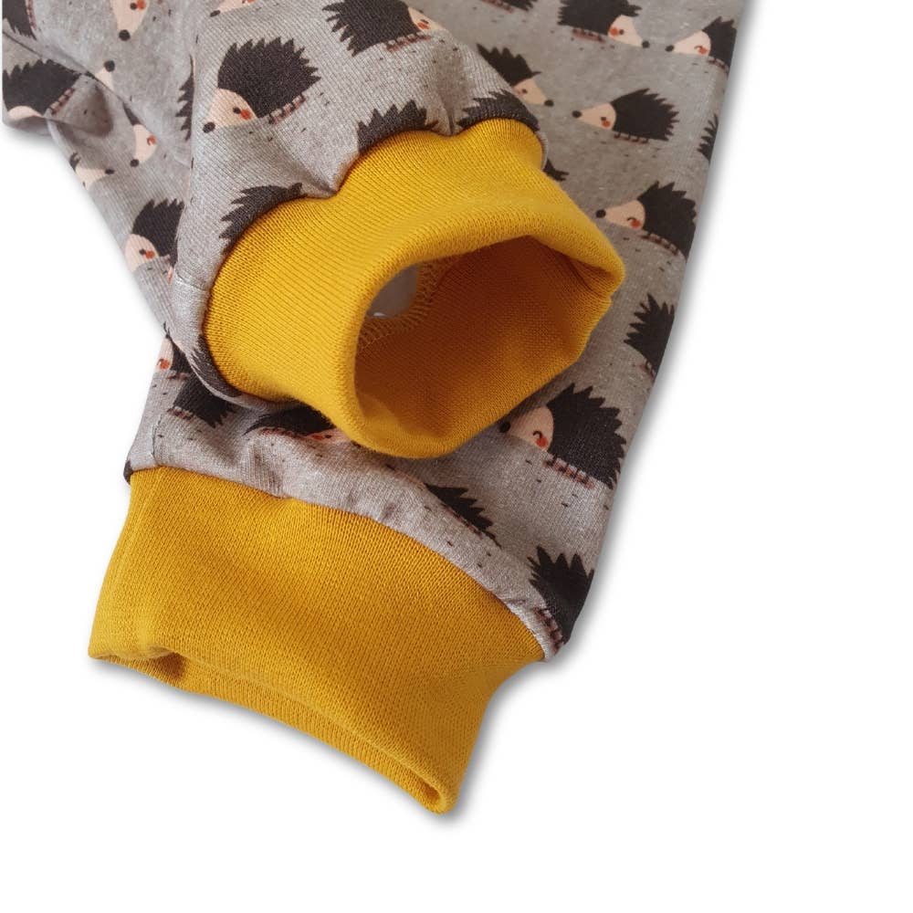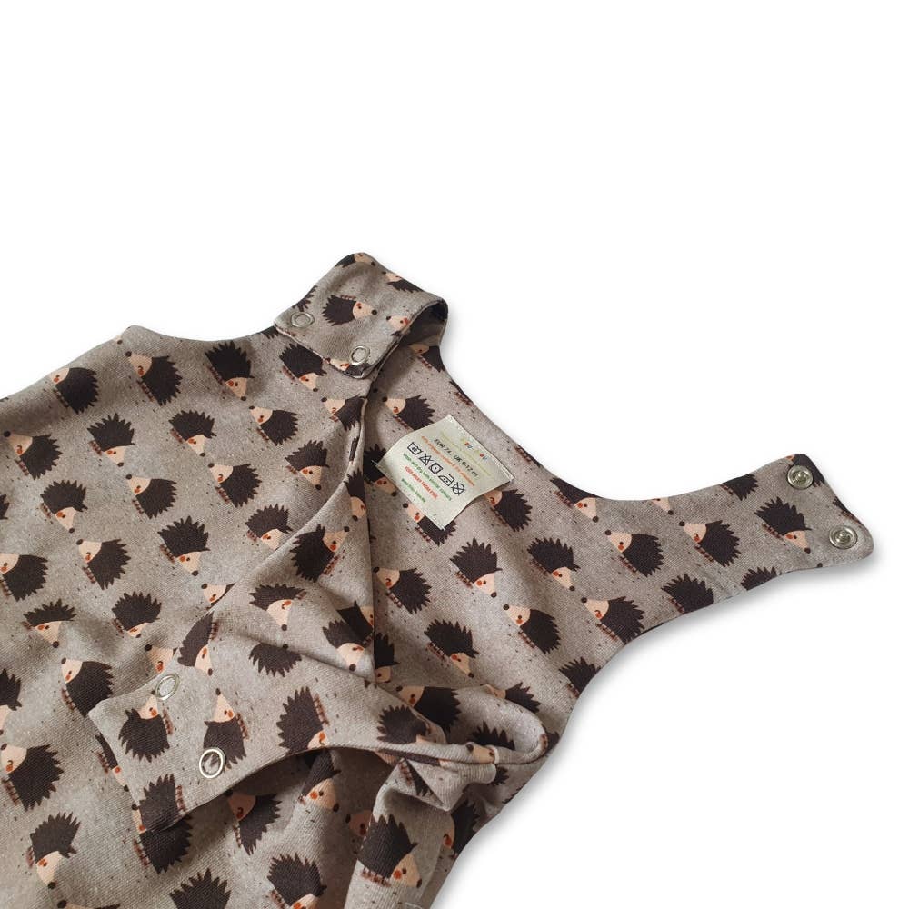 Our Hedgehogs Organic Cotton Jersey Baby Romper is made in Ireland from certified organic cotton, this sustainable baby romper is soft, breathable, and safe for sensitive skin. The premium jersey fabric is free from harmful dyes and chemicals, ensuring comfort and eco-friendly quality. Nickel-free shoulder snaps make dressing and nappy changes quick and irritation-free. Designed with a mellow, latte colour background and hedgehog print and contrasting, warm ochre cuffs, it offers gender-neutral style for the colder season. Durable, flexible, and machine washable, this organic baby romper delivers lasting comfort and practicality. Made from soft, organic cotton jersey – Composition: 95% organic cotton, 5% elastane – Stretchy cuffs – Semi lined – Nickel free YKK poppers on shoulder straps – Machine washable at 40 °C – Handmade in Ireland