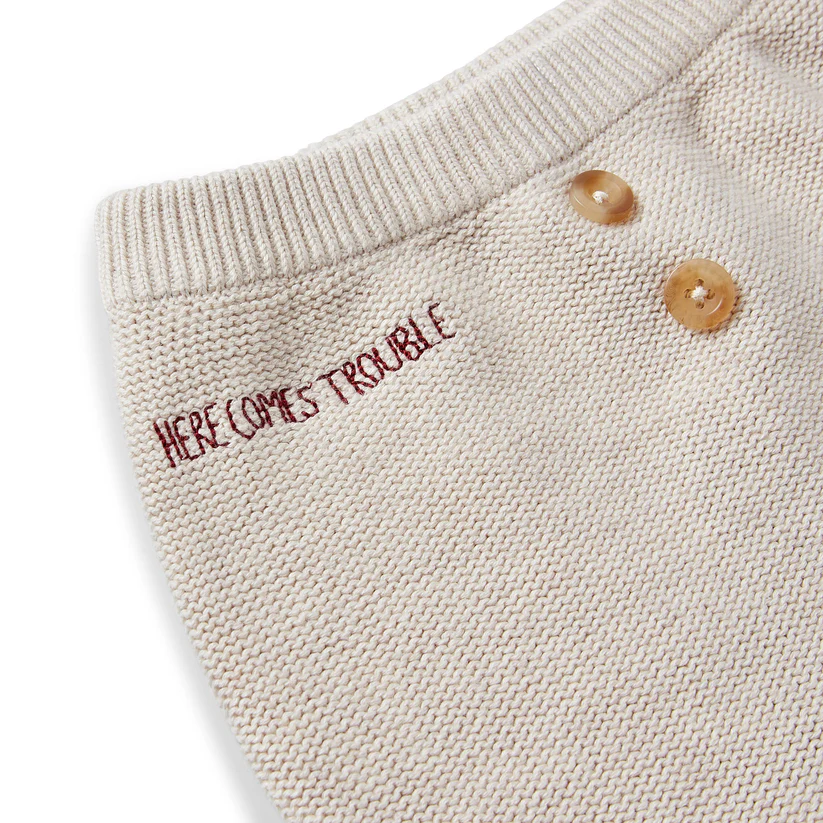 Crafted from a soft organic cotton knit, these joggers feature delicate embroidery including a classic red tractor, a gentle sheep, and the playful phrase “Here Comes Trouble” subtly stitched at the hip for a hint of personality.