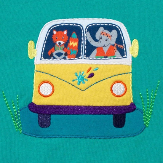 * Fun, child-approved design, with an appliqué of a fox and elephant driving in a campervan