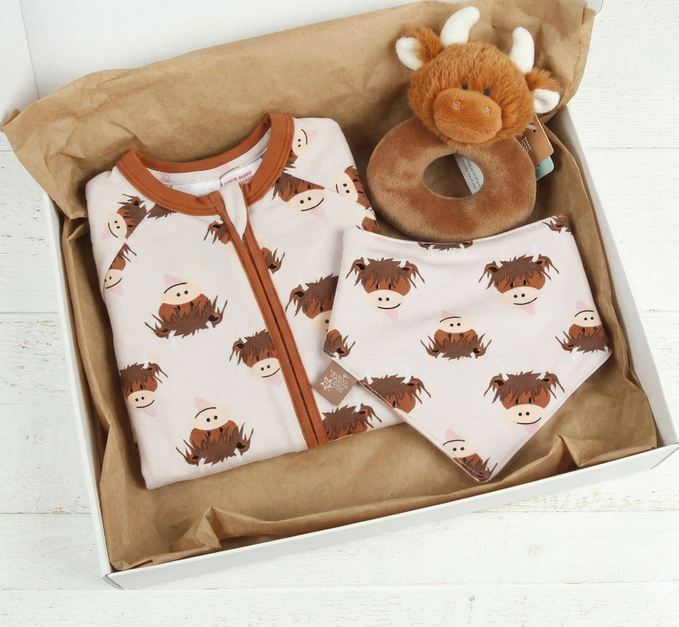 Ever popular Highland Cow themed, this gift box features a romper in size 0-3 months, along with matching bib and a soft ring rattle, easy for tiny hands to hold. All items suitable from birth, making it an ideal new baby gift.