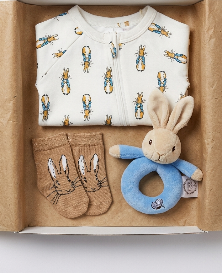 A timeless classic, this gift box features Peter Rabbit romper in size 0-3 months, along with socks (0-6 months) and a soft ring rattle, easy for tiny hands to hold. All items suitable from birth, making it an ideal new baby gift.